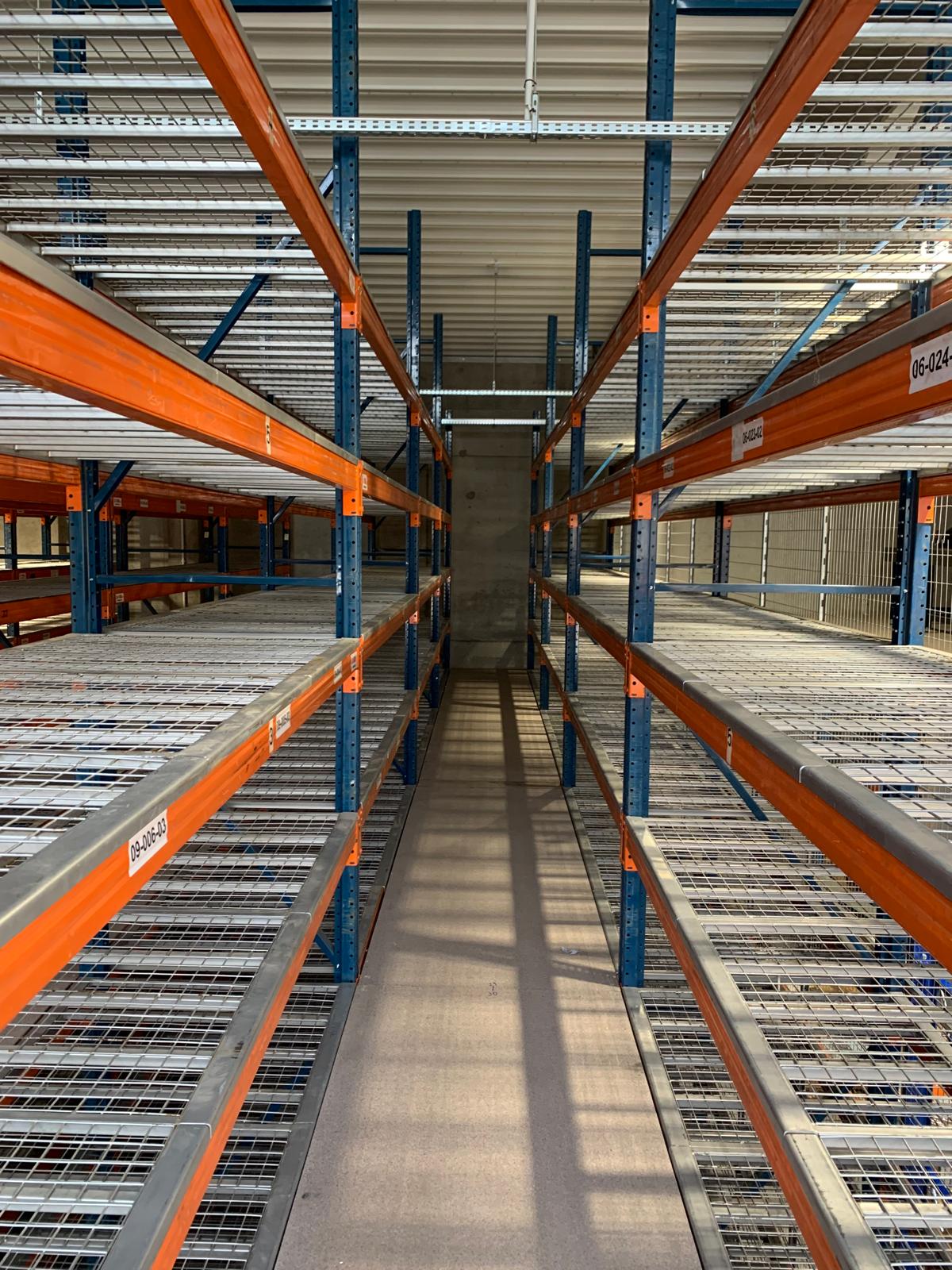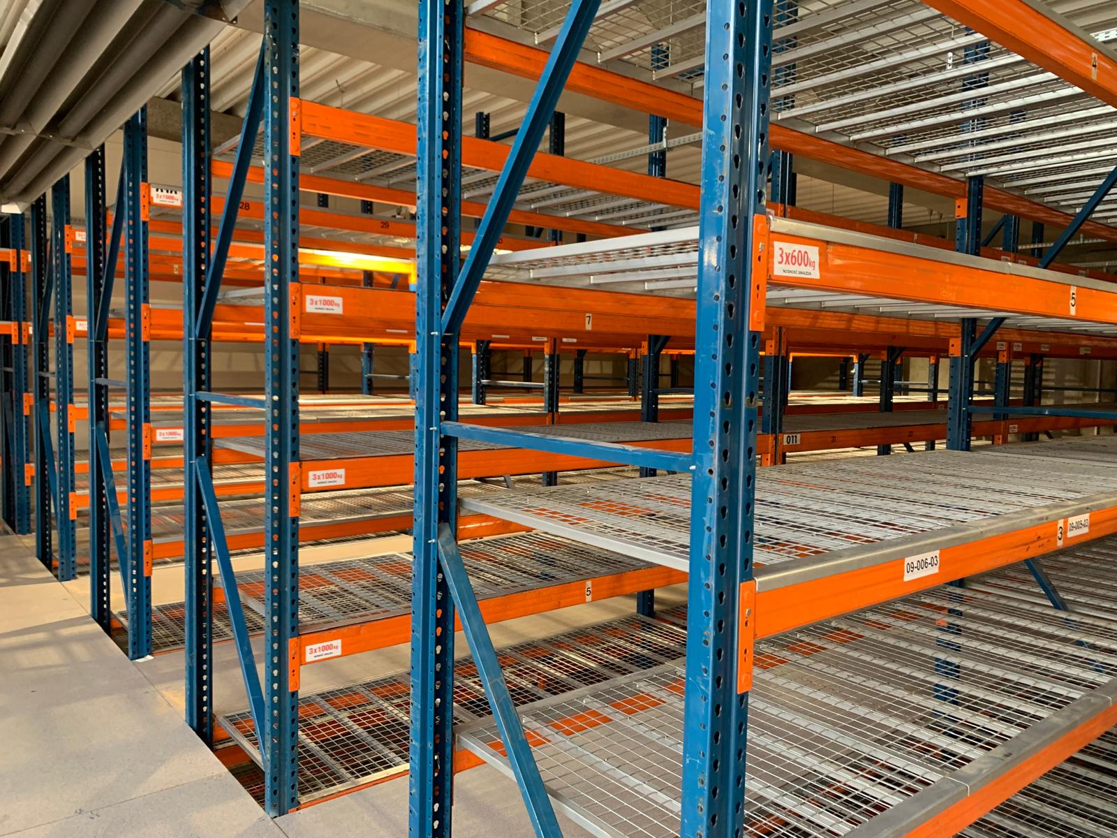 • Przemysłowy regał metalowy wielopoziomowy w przestrzeni magazynowej